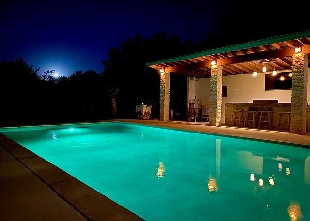 Deck, Patio, BBQ Grill, Outdoor Shower, Private Pool, 2 BBQ Grills, Treehouse, Pool Patio, Outdoor Bar, Outdoor Entertainment Area, Covered Porch, Bird Watching, Corn Hole, Custom Built Rock Fire Pit, Tetherball, Outdoor Fire Pit, Deer Watching, Cabana, Pool Side Shade Structure, 3 Covered Porches, Swing, Corn Hole, Board Games, Hammock, Party Lights, Poolside Shower, Poolside Lounge Chairs, Cabana TV, Poolside Lighting, Covered Deck, Tree Swing, Party Lights, Poolside Night Lighting, Rock Sidewalks, Fenced Backyard, Private, Views, Gated, Underwater colored Pool light, Poolside Cabana